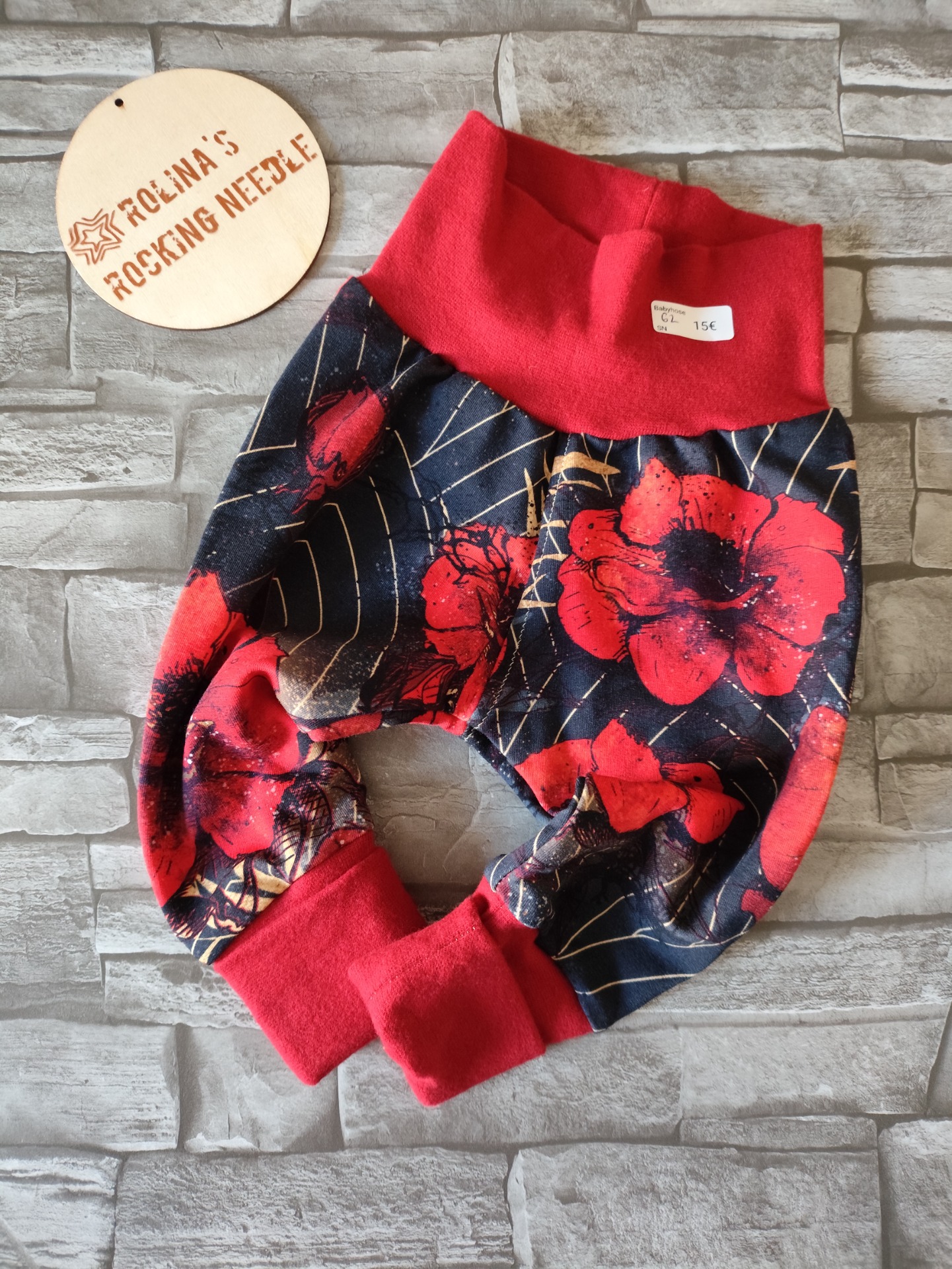Einzelstück, bequeme Babyhose aus Sommersweat mit wunderschönem Mohnblumenprint und roten Bündchen.
