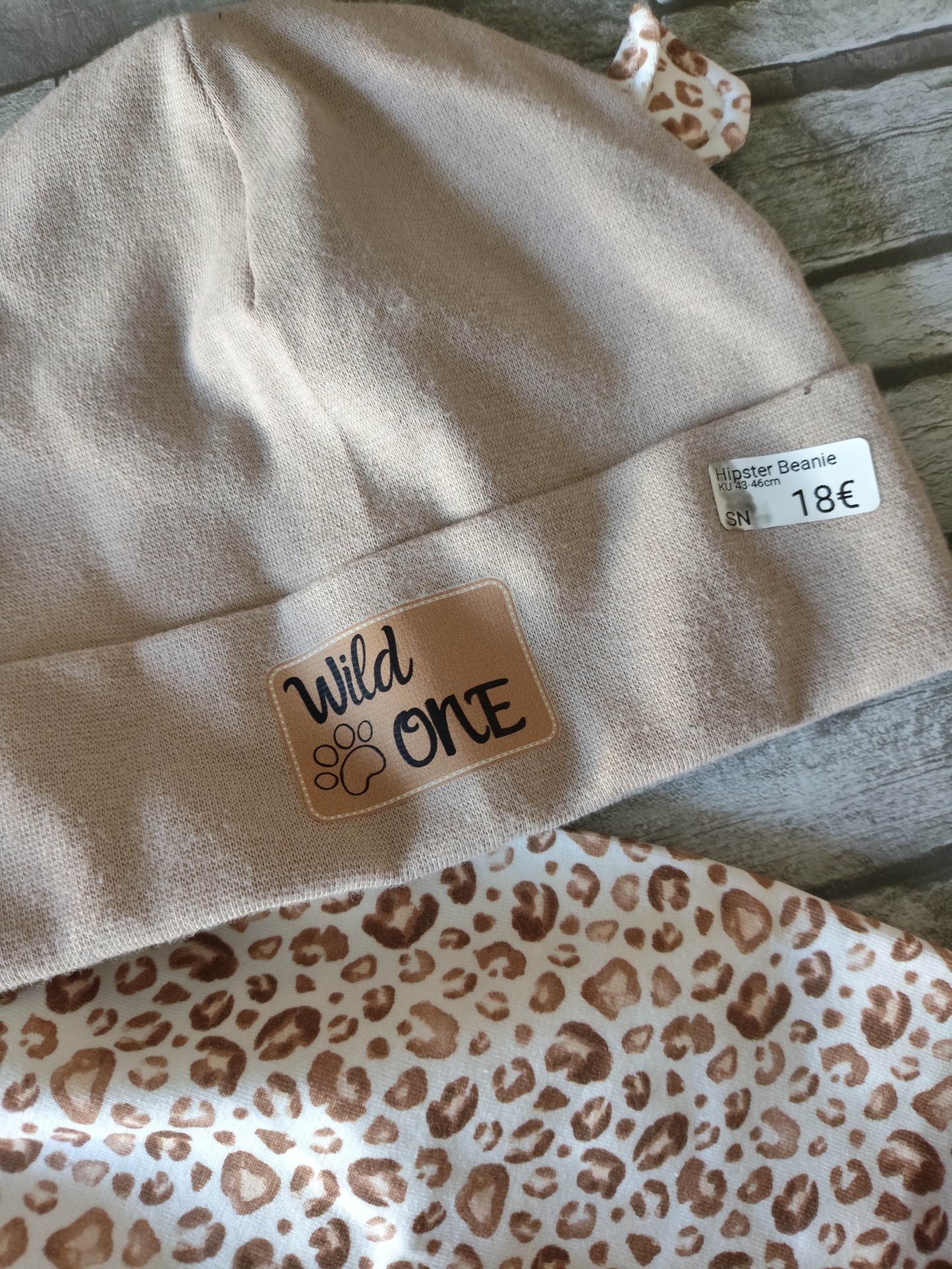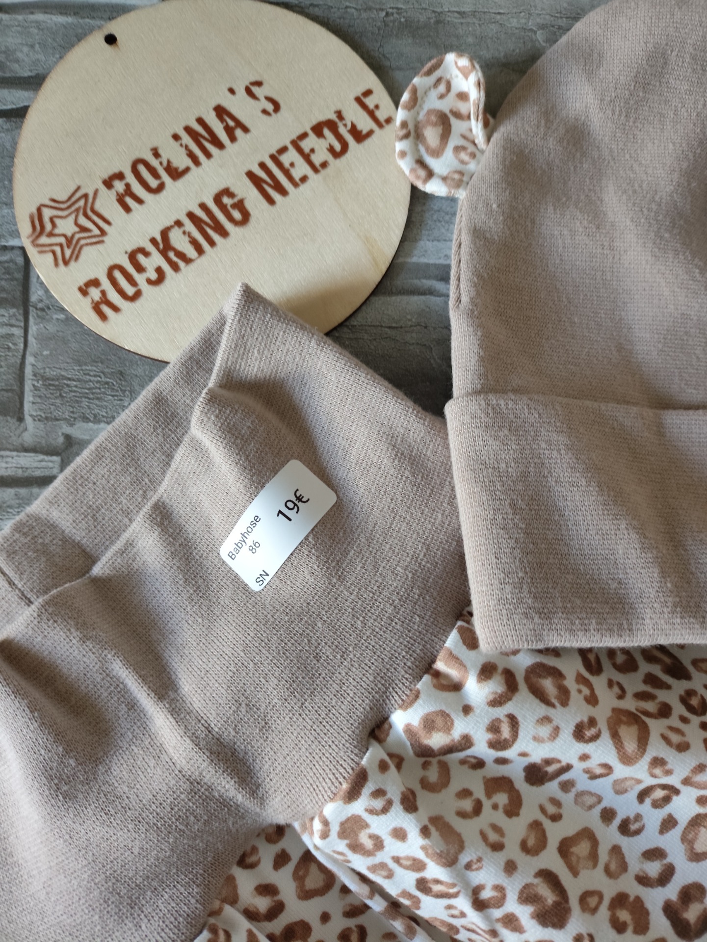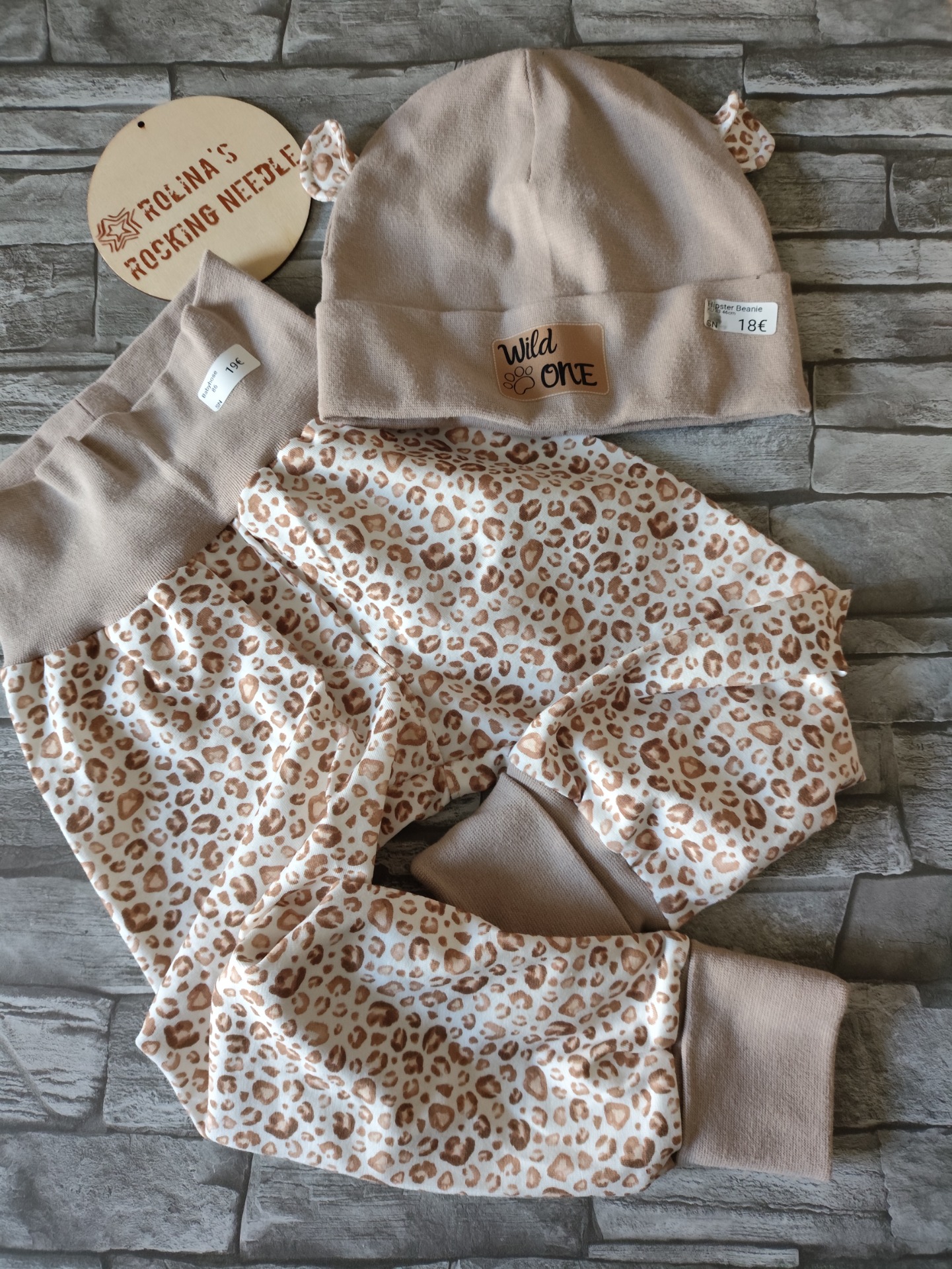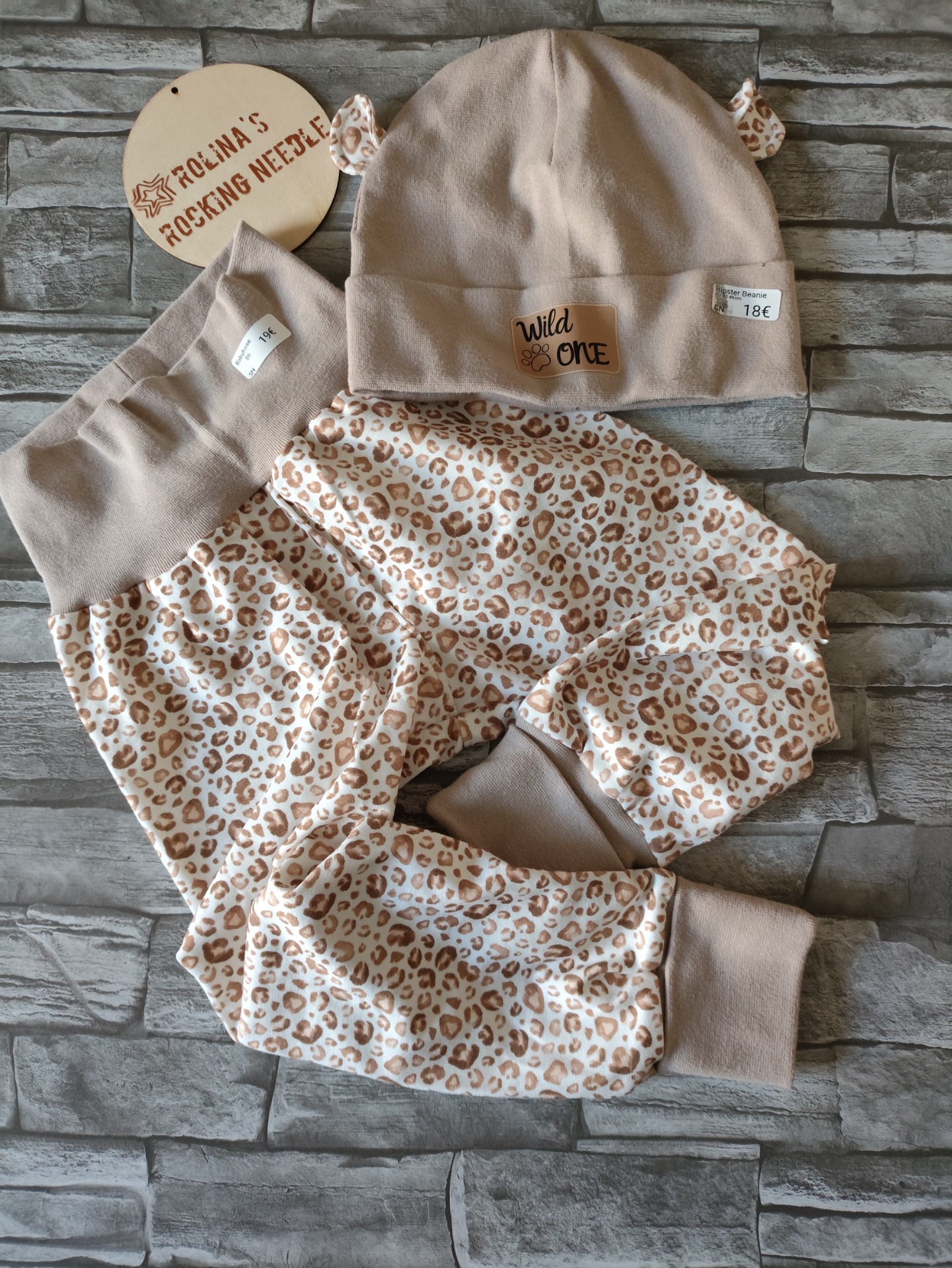 Hose aus dünnem Jersey und Mütze aus Bündchenmaterial mit wilden Ohren.